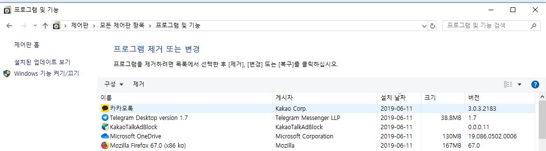 프로그램 삭제는 제어판-프로그램 및 기능에서 삭제 가능합니다.