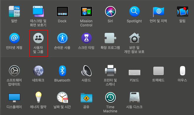 2. 시스템 환경설정에서 "사용자 및 그룹" 선택