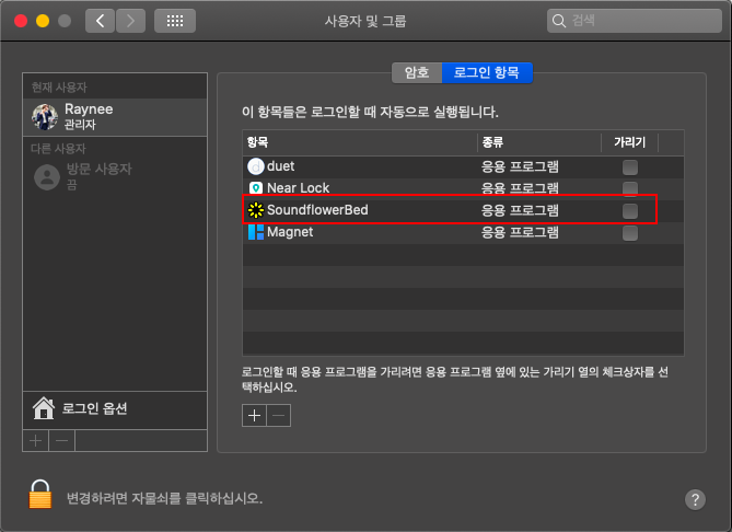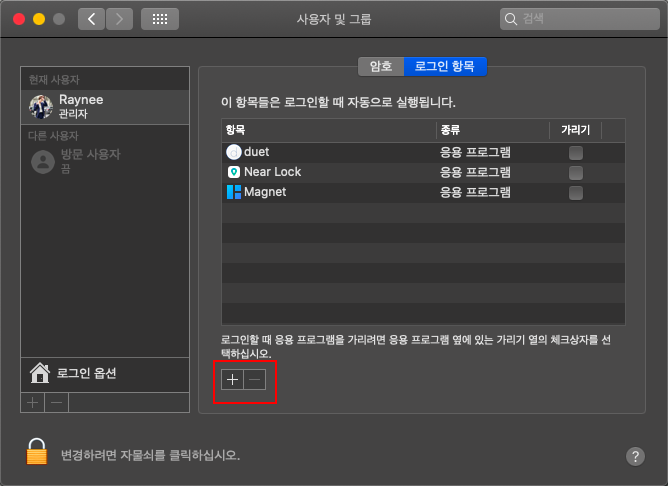 반대로 삭제하고 싶은 어플리케이션은 자동로그인 항목에서 선택후 "-"로 제거