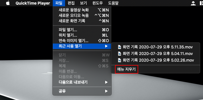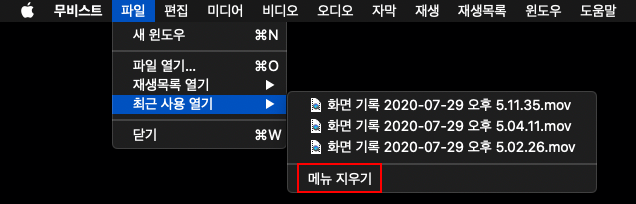 Quick Time Player 실행 - 파일 - 최근 사용 열기 - 메뉴 지우기