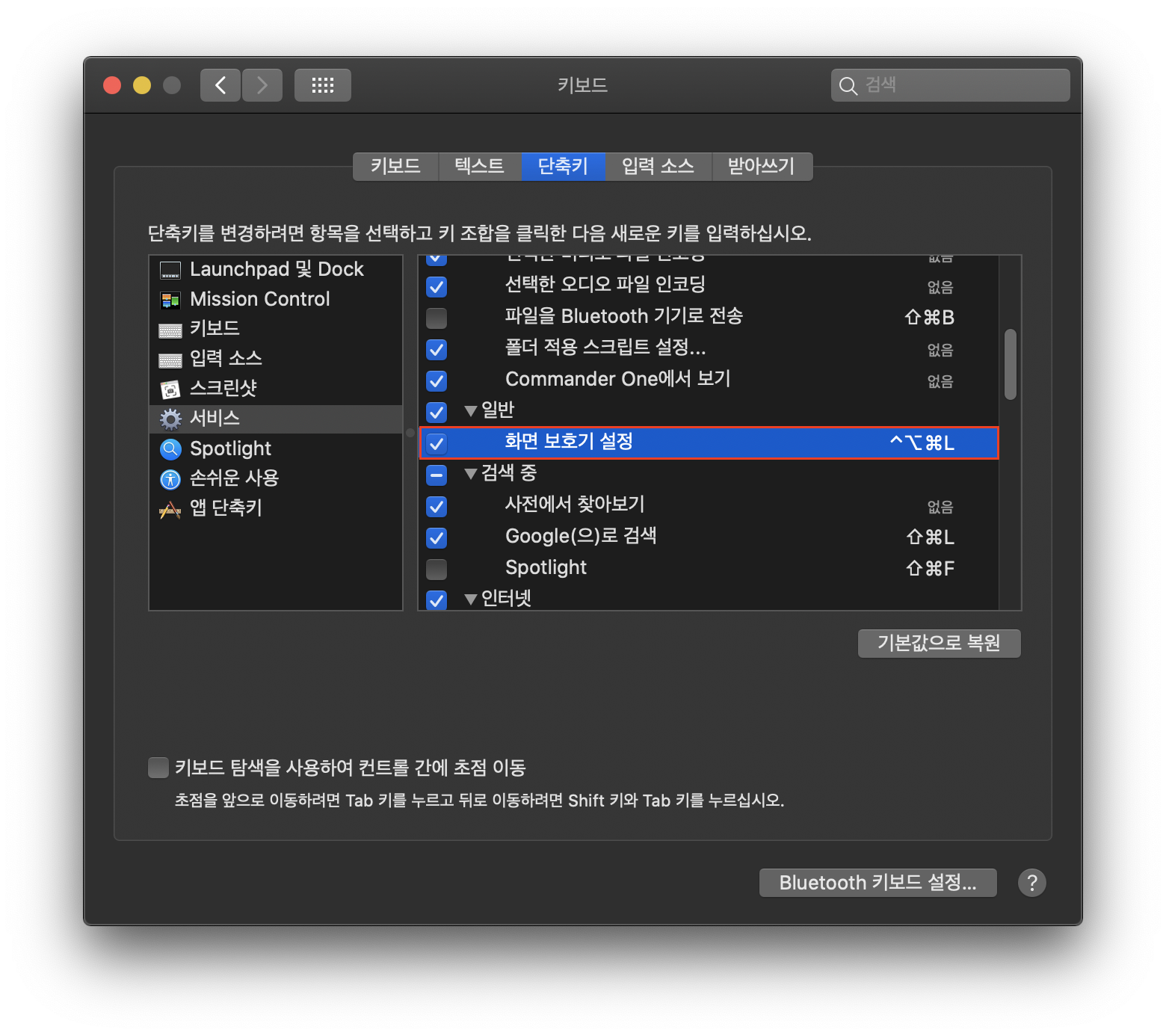 Automator로 화면보호기 값을 저장하였다면, 키보드에서 단축키를 지정합니다.