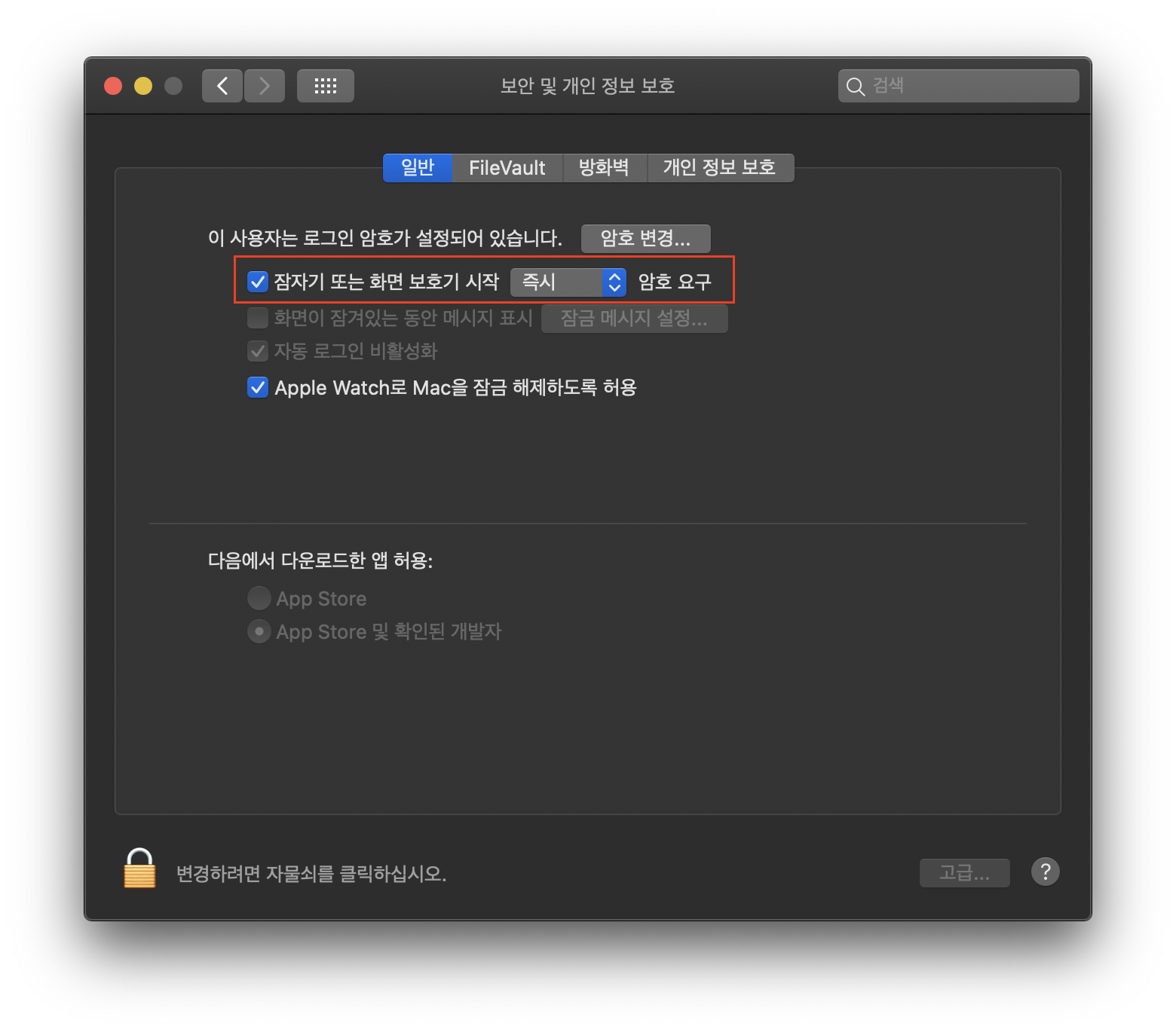 마지막으로 화면보호기 실행하고 다시 사용화면으로 전환시 암호를 입력하게끔 하여, 보안성을 강화 합니다.