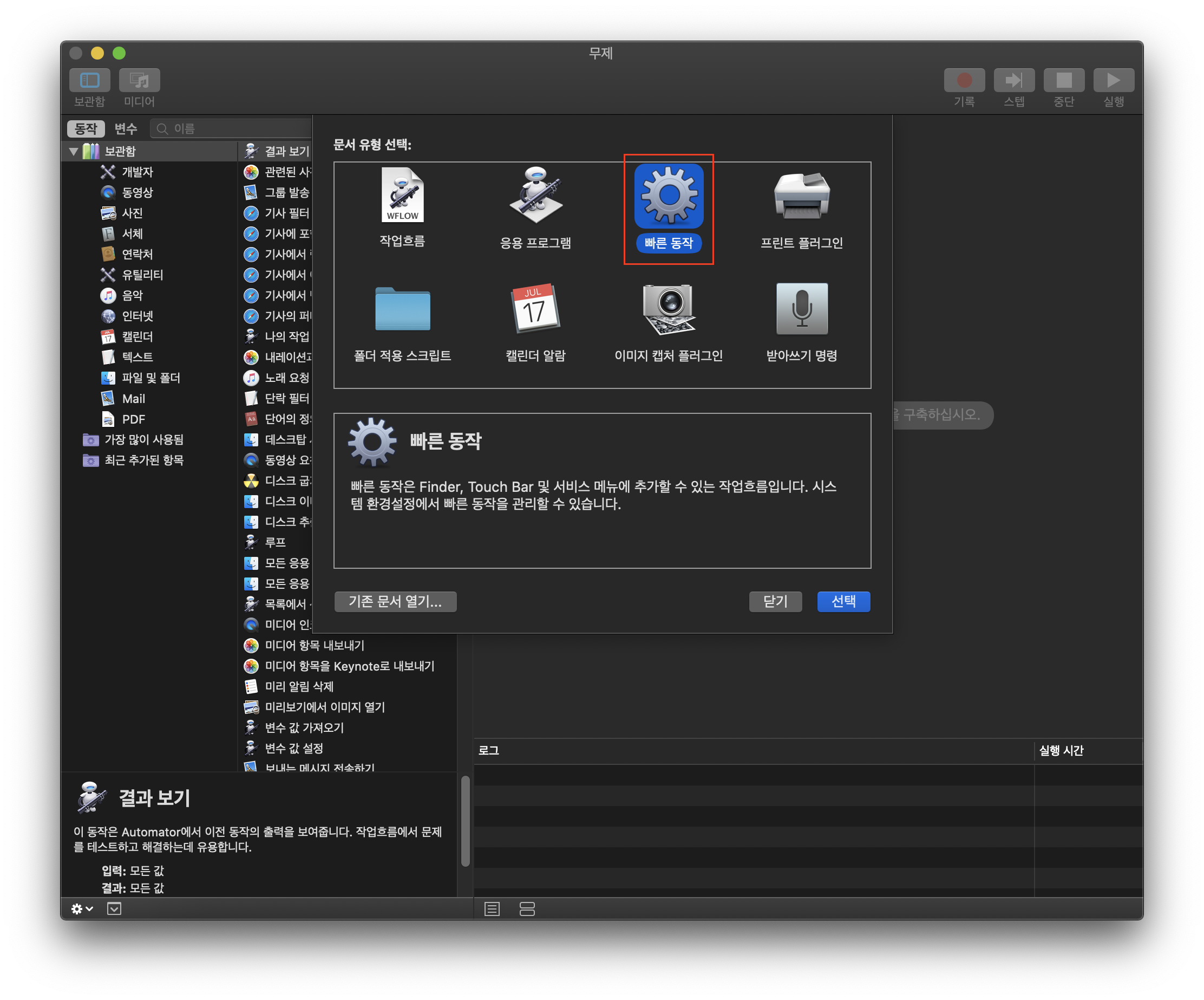 1. [ Automator 실행 ] - [ 빠른 동작 ]
