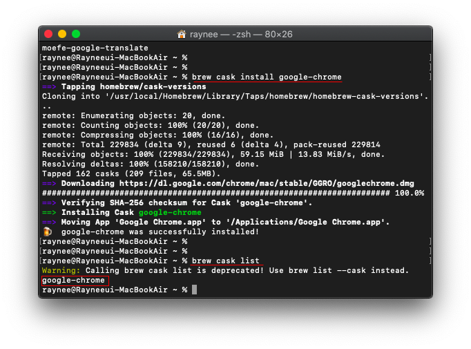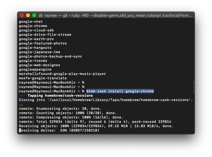 구글 크롬이 설치되었고, brew cask list를 보시면 google-chrome가 설치된 화면을 볼 수 있습니다.