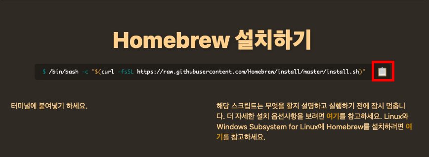 아니면 홈페이지에서 아래와 같이 복사 버튼 클릭하여 명령어 복사.