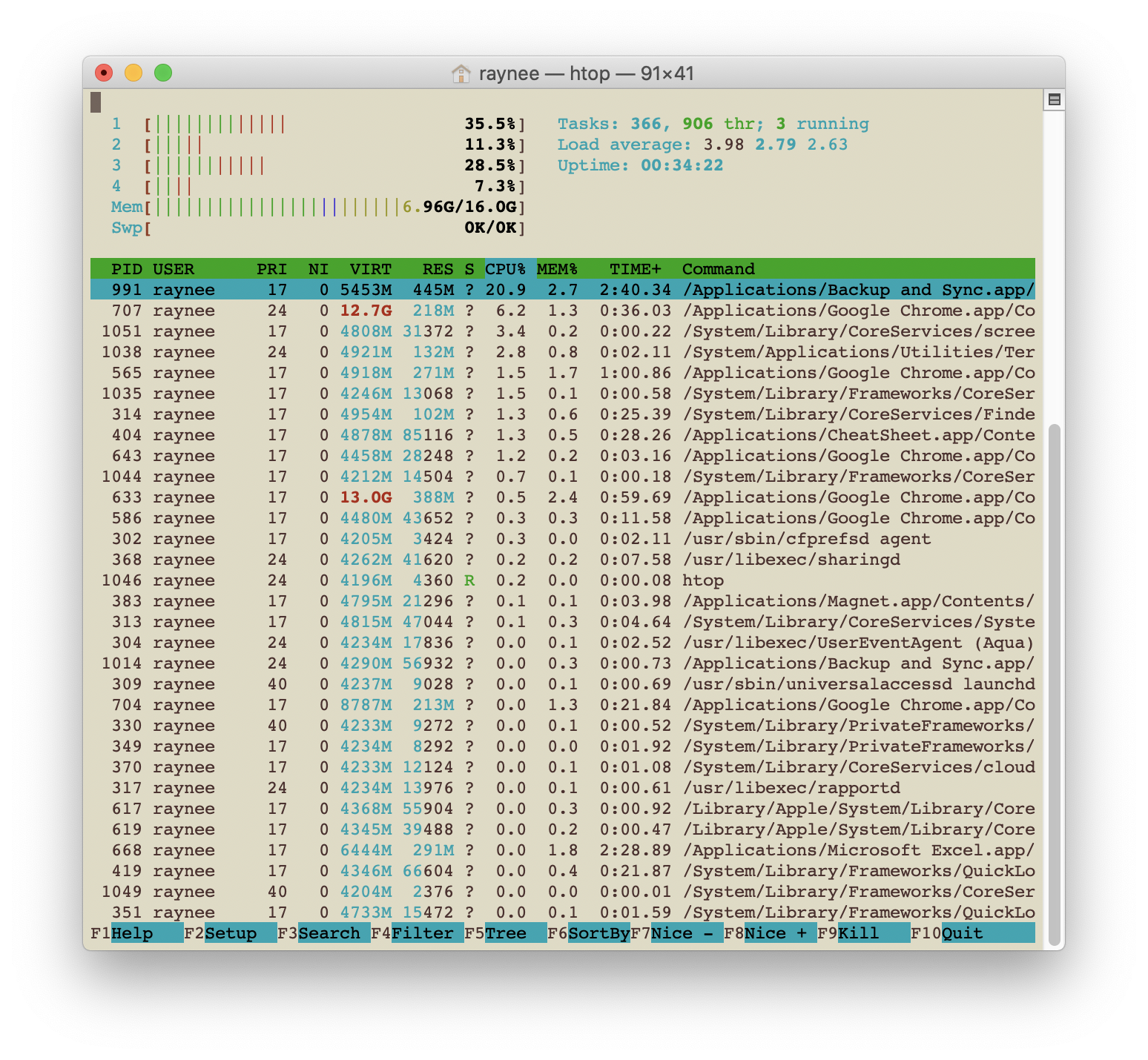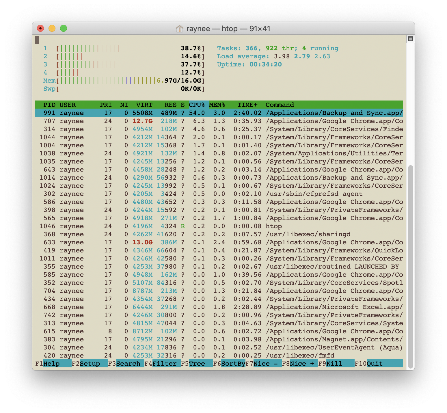 Homebrew 패키지인 htop를 이용하면 간단하게 명령어 한줄로 현재 사용량을 실시간으로 확인 가능합니다.