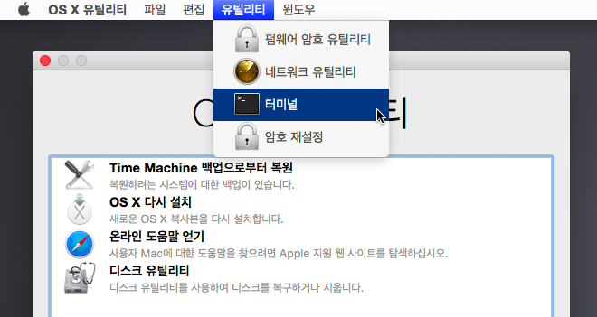 해당 모드를 변경하려면 복구모드에서 진행합니다. 재부팅을 누르고 Command(⌘)-R 눌러 복구모드로 진입합니다.