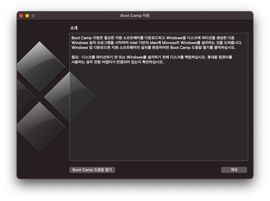 Windows11_Delete_Version.ISO이 준비 되었으면 BootCamp를 실행 시켜줍니다.