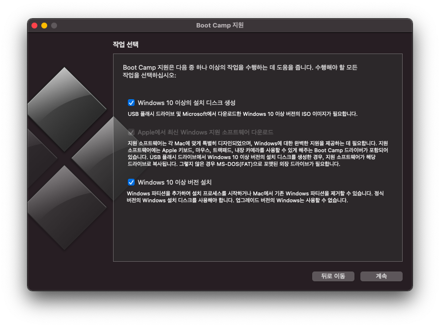 만약 Bootcamp에 윈도우가 설치되어 있으면 삭제하고 만들면됩니다.