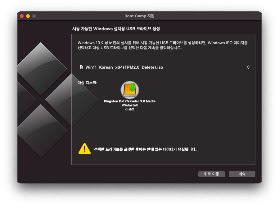 외예로 맥OS의 Bootcamp는 Windows11이 지원에 안되어 정상적인 방법으로는 설치가 안됩니다.