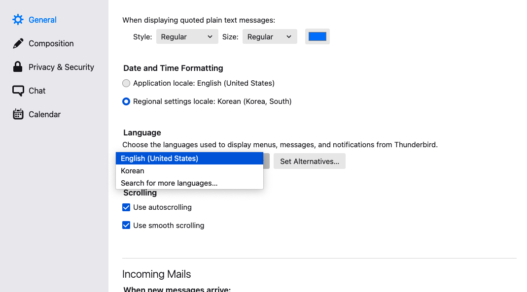 썬더버드 자체에서 한글패치를 받은 후 한글을 적용 해주면 끝입니다.