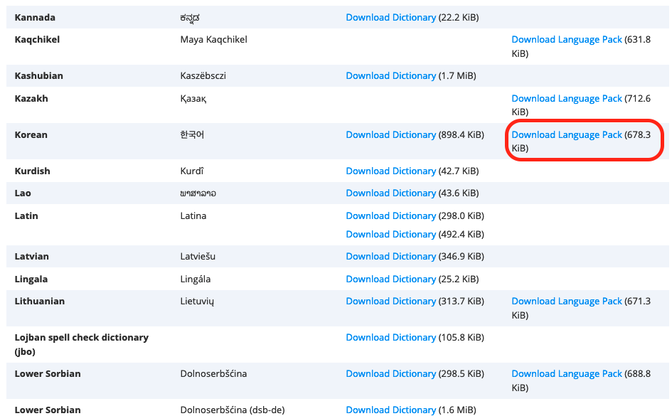 저희는 한글을 사용할 꺼니 검색 옵션에서 "korean"을 해줘도 되고 스크롤을 내려서 korean을 찾으면 됩니다.