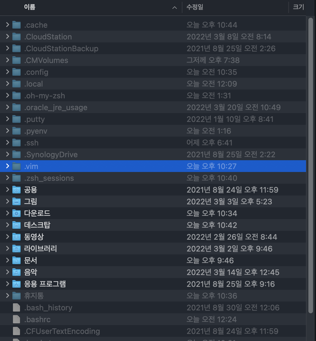 아까 만들었던 .vim 파일이 보인다. 저기에 스킨을 받아 넣어 주세요.