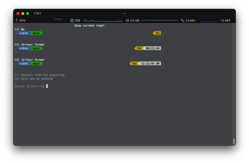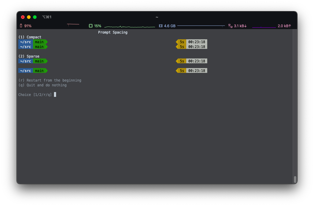 P10K 테마가 설치가 되었고, 설정 화면으로 넘어 갑니다.