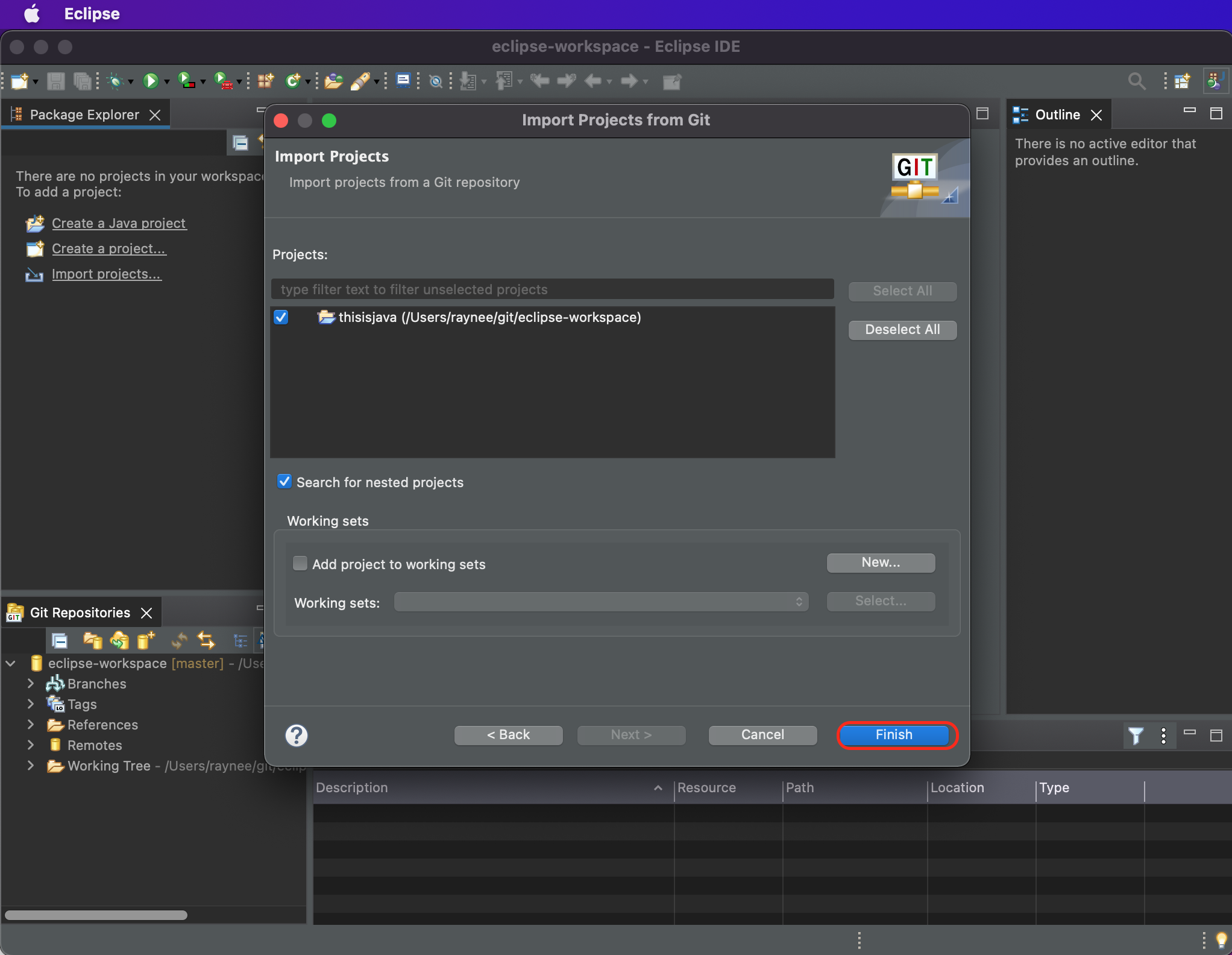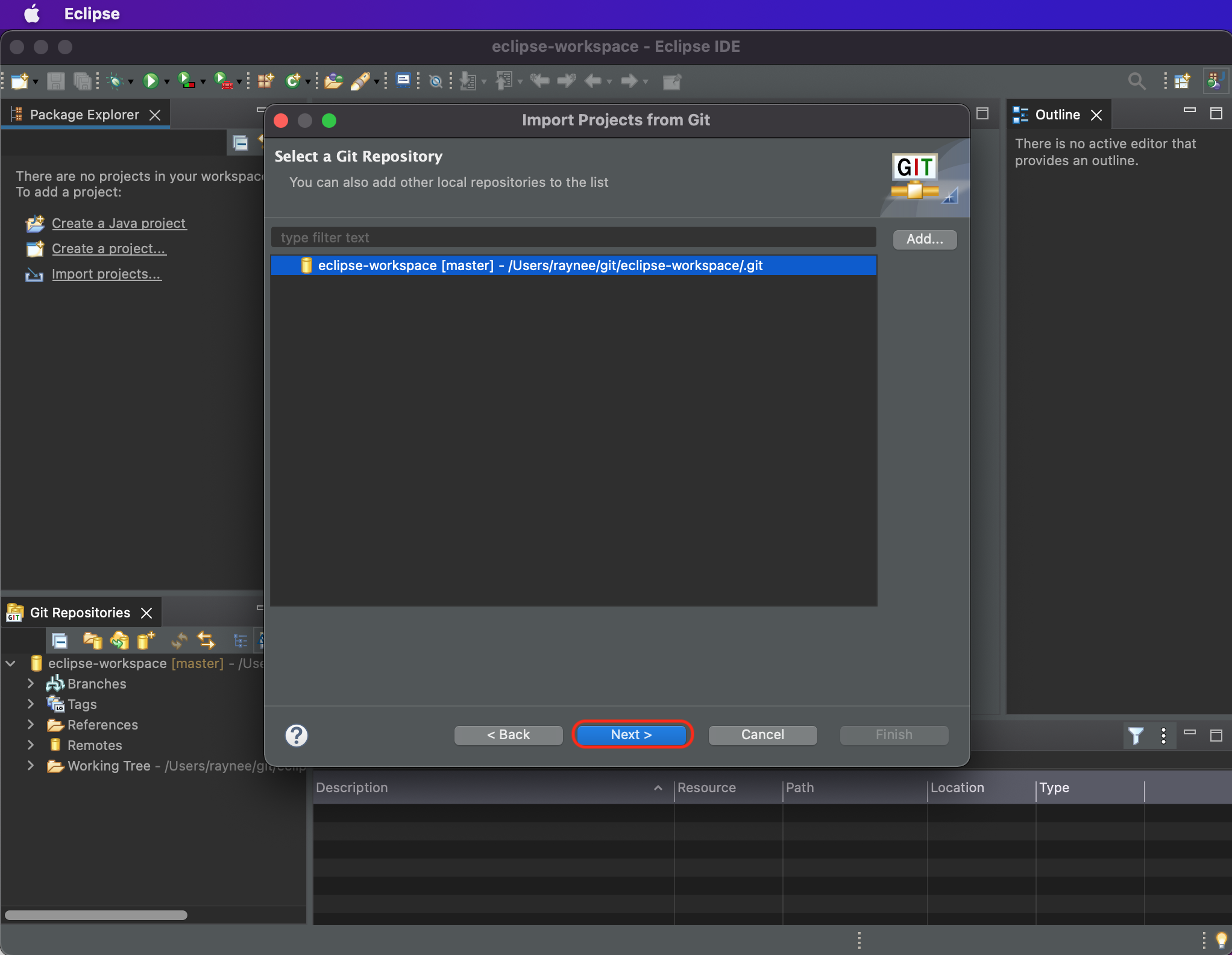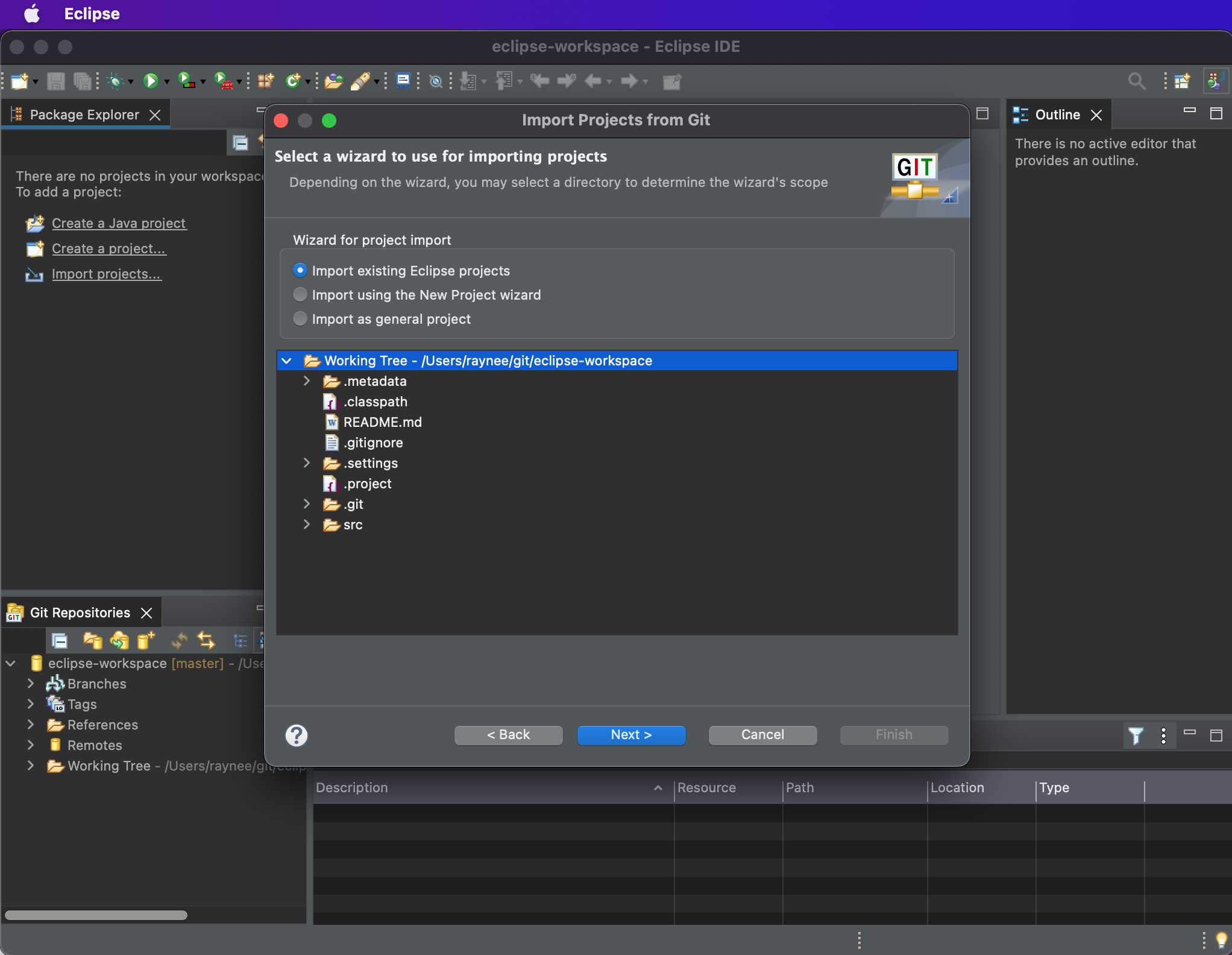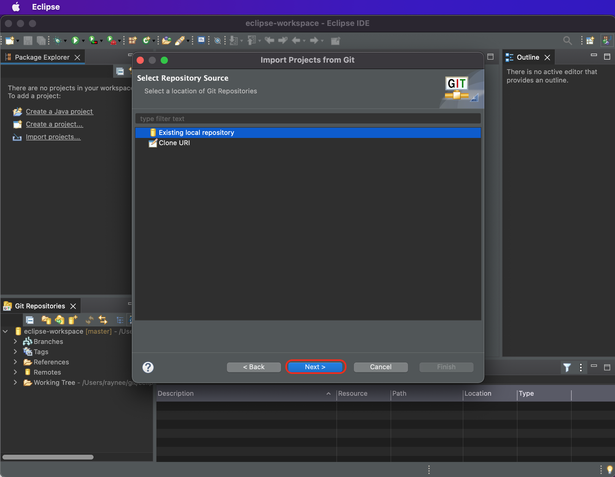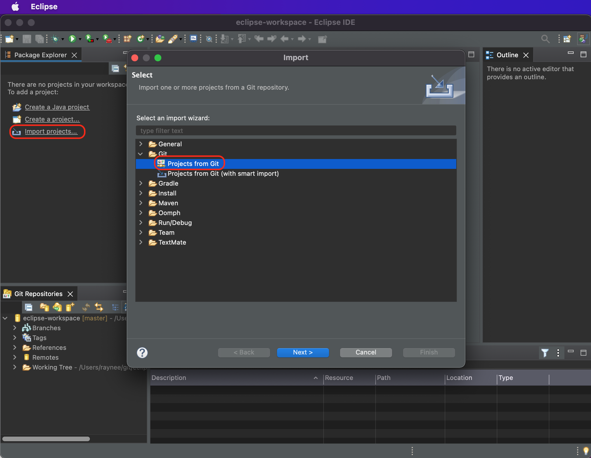 이제 이클립스 자바에서 저장소의 프로젝트를 가져 옵니다.
