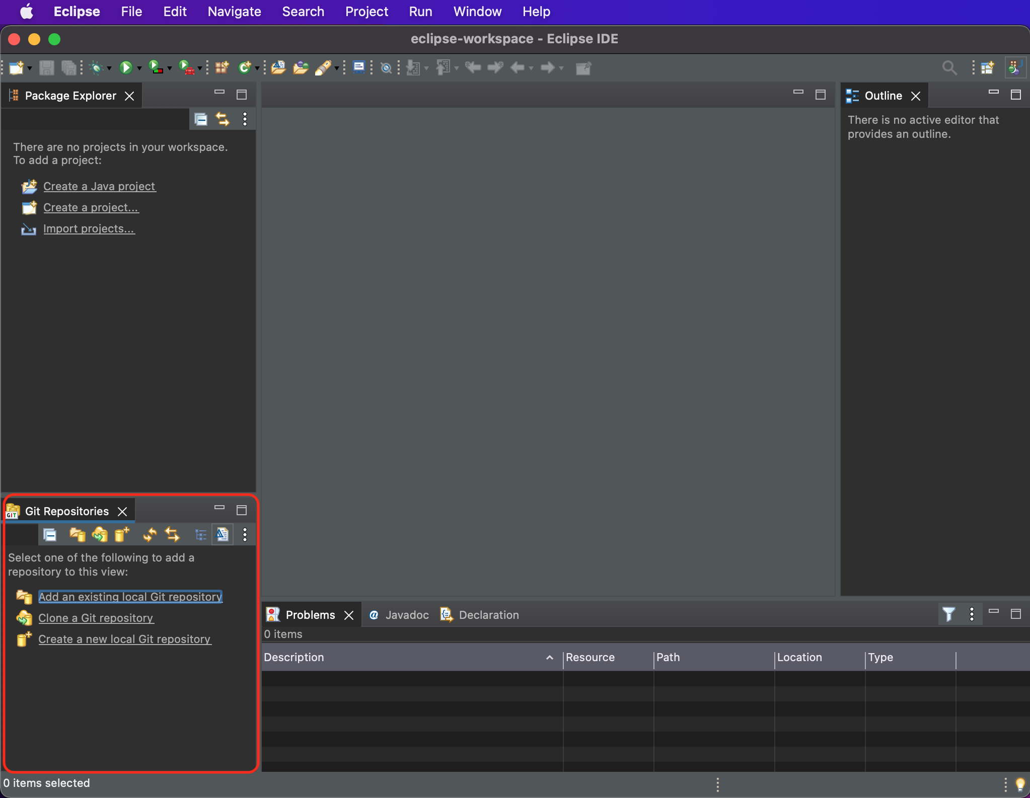 보시는 것 처럼 아직 프로젝트가 하나도 없는 상태 입니다. 여기서 Git 저장소를 추가하고 저장소에 있는 프로젝트를 가져 오겠습니다.