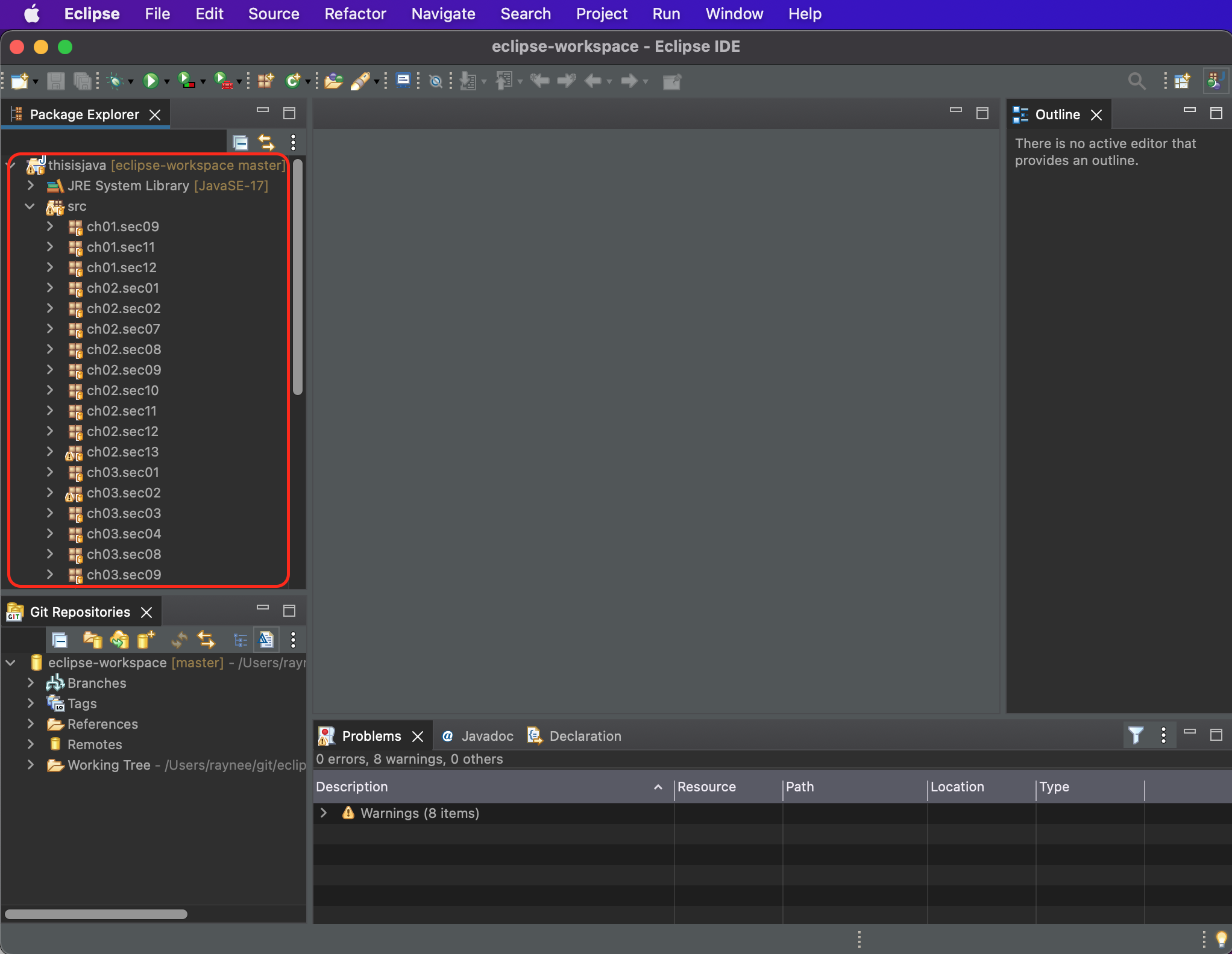 왼쪽 하단에 Git Repogitory를 정상적으로 가져온걸 볼 수가 있습니다.