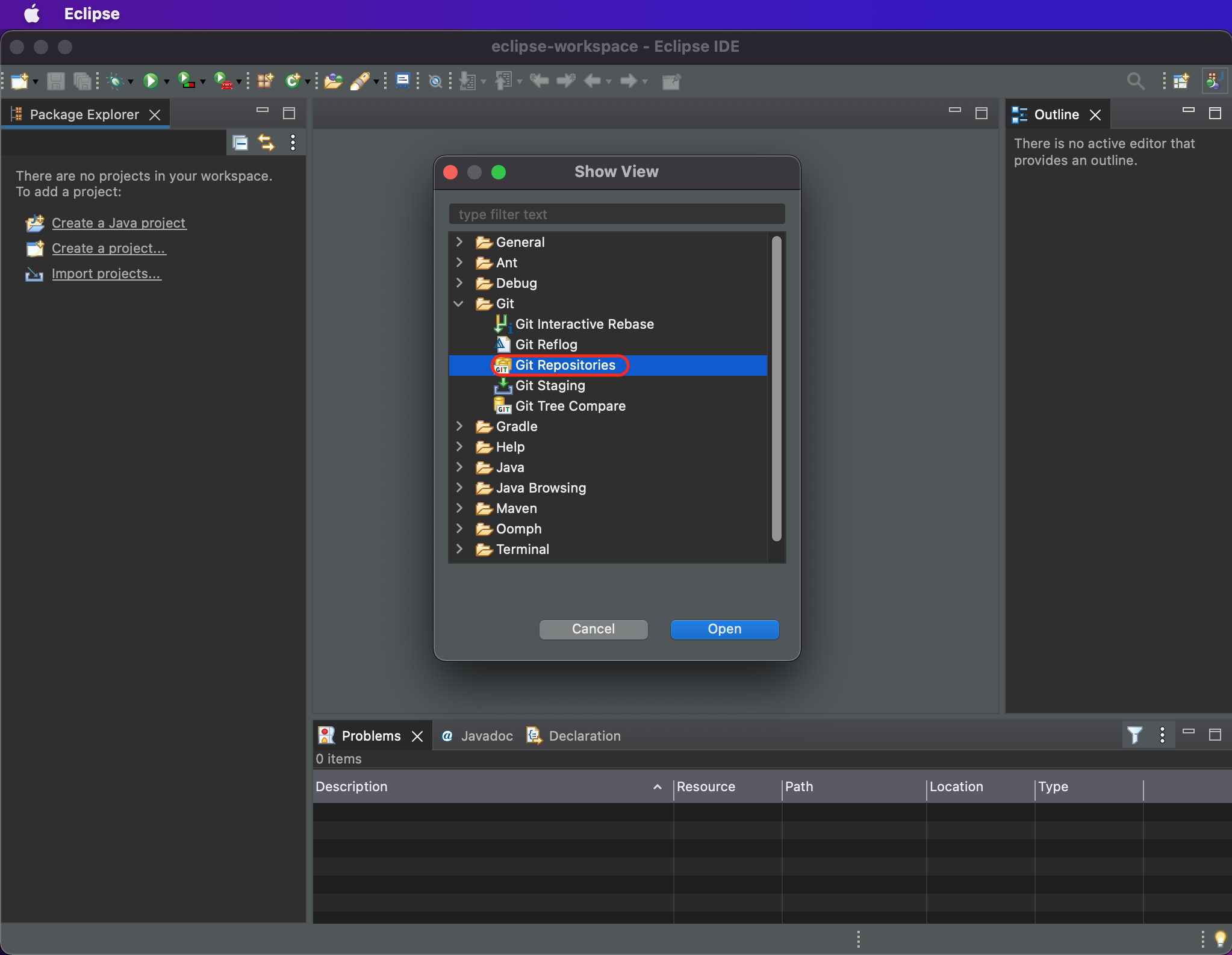 show View 창이 뜨면 Git - Git Repositories를 클릭하여 Open 하여 줍니다.