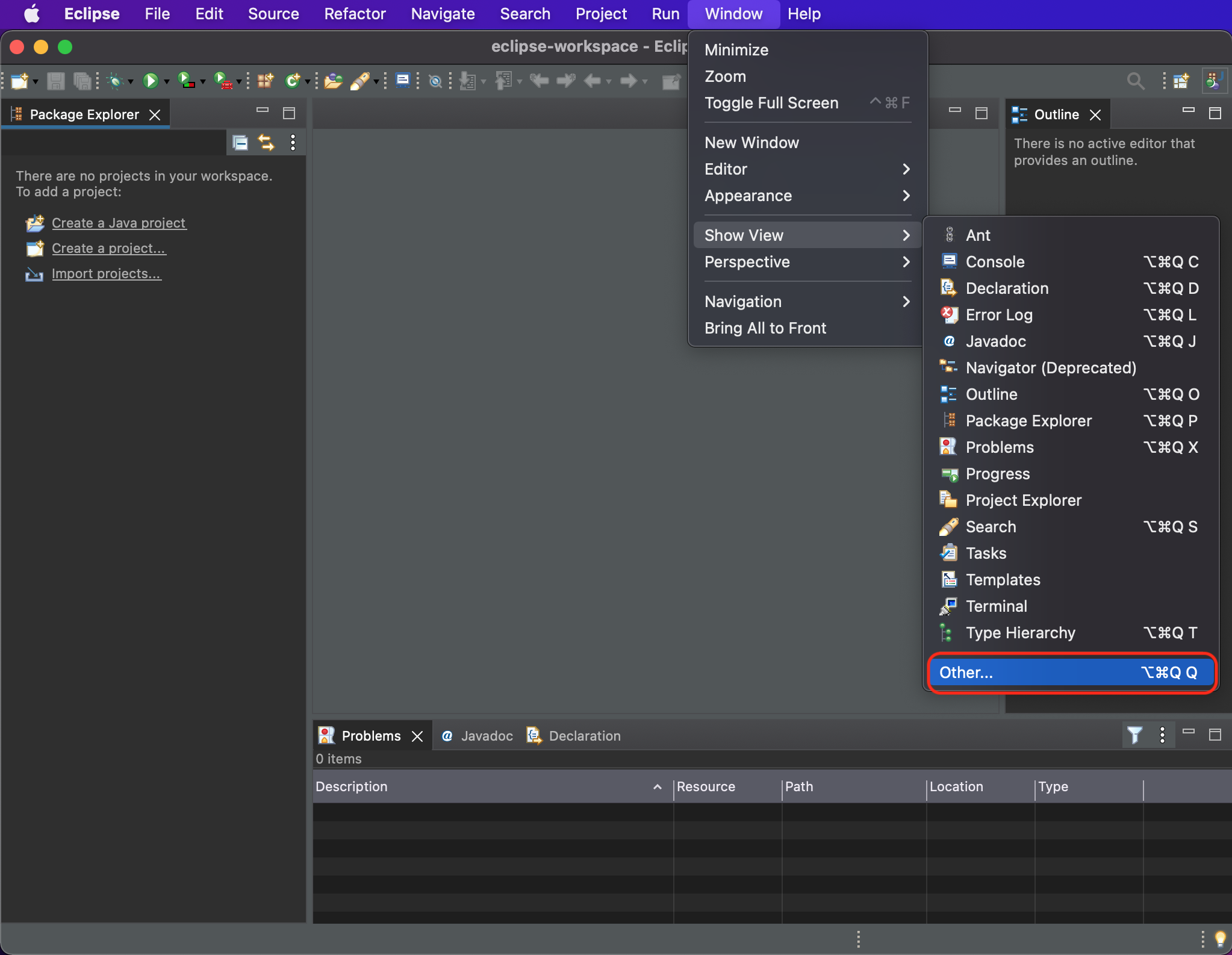 "Windows - Show View - Other"를 클릭 해주세요 .