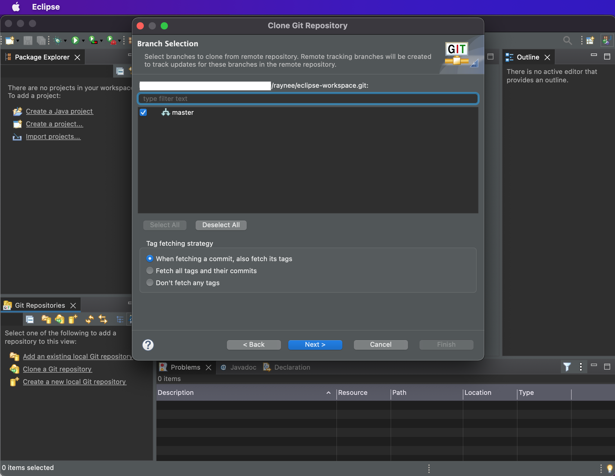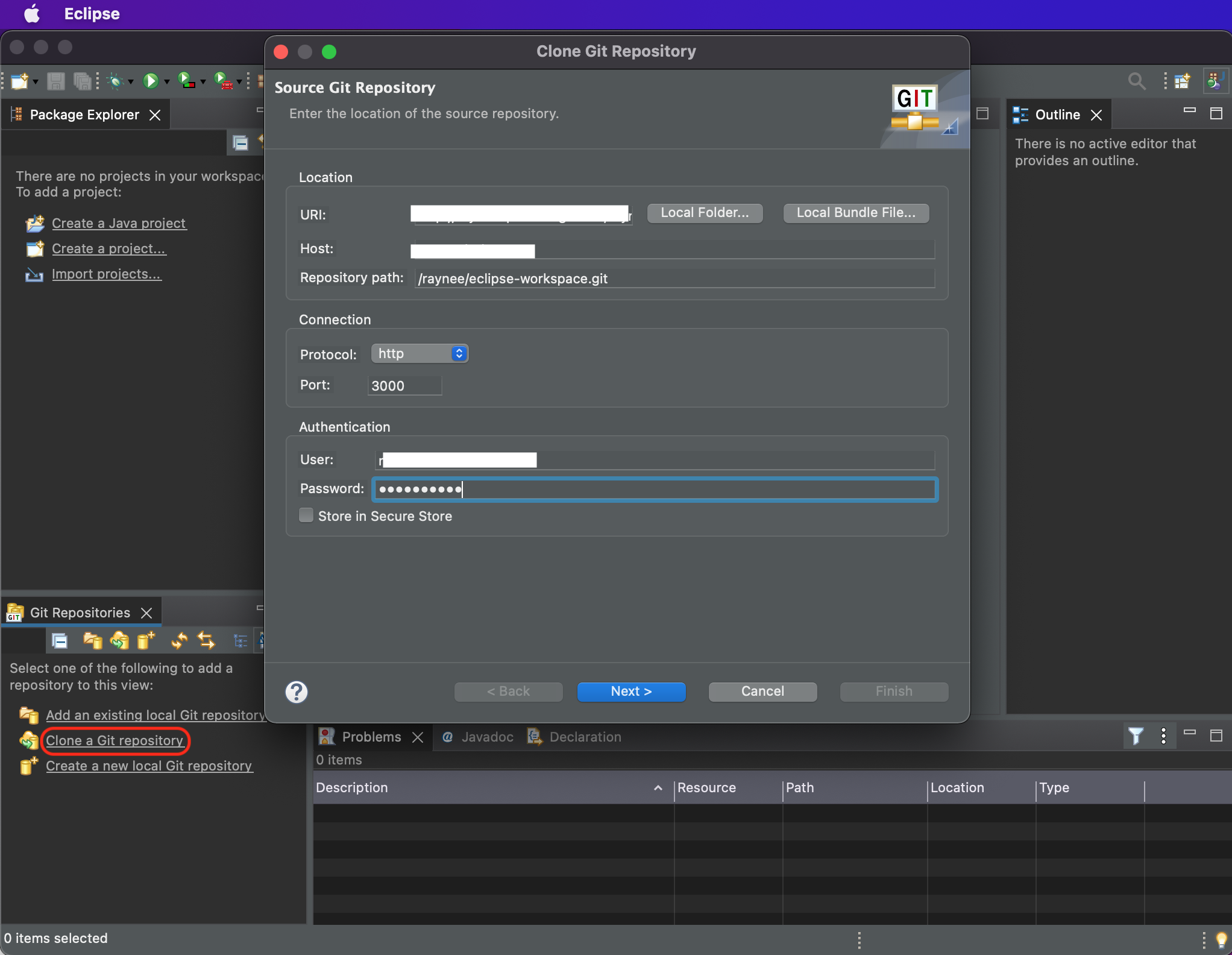 주소를 복사 하였으면 다시 이클립스 자바로 들어와 Git Repositories에서 Clone a Git Repository를 선택하여 줍니다.