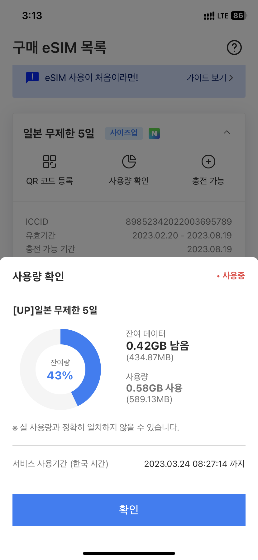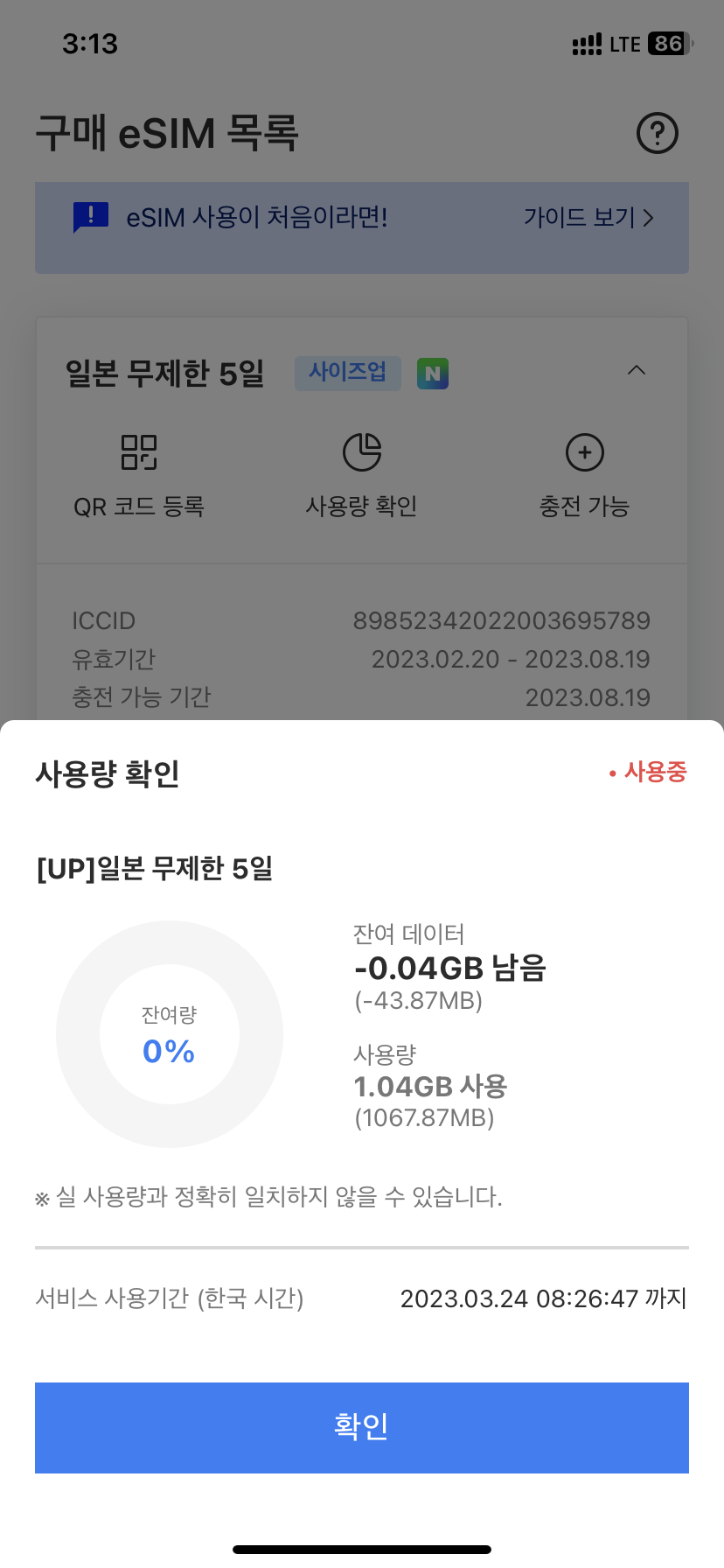 앱을 통한 데이터 사용량 확인 불가, 한번 E-sim 등록하면 재등록 불가