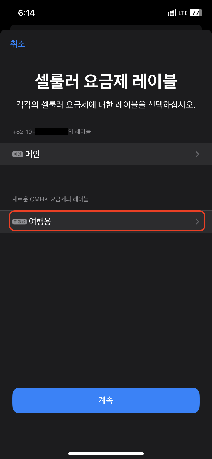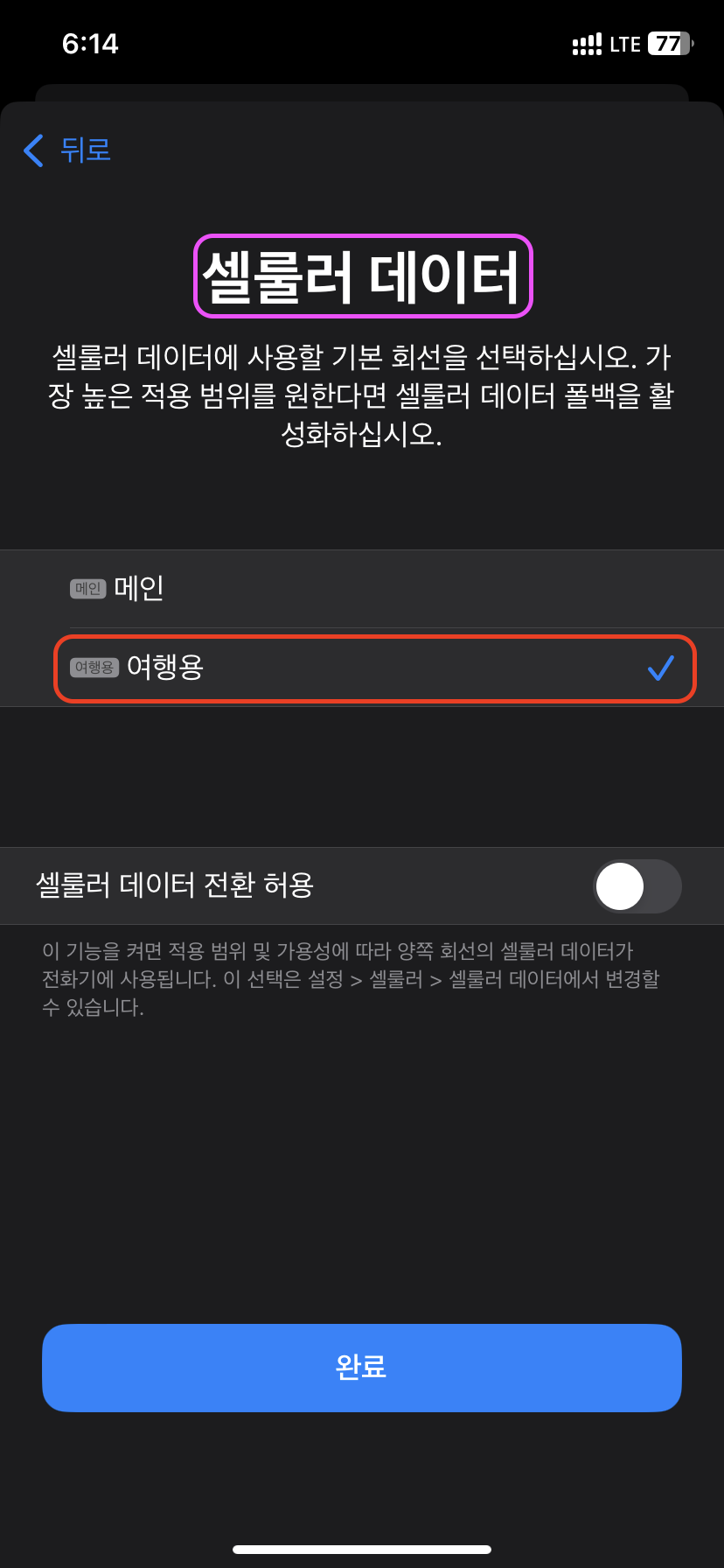 여행용 선택하여 데이터 로밍을 선택해 줘야 한다.