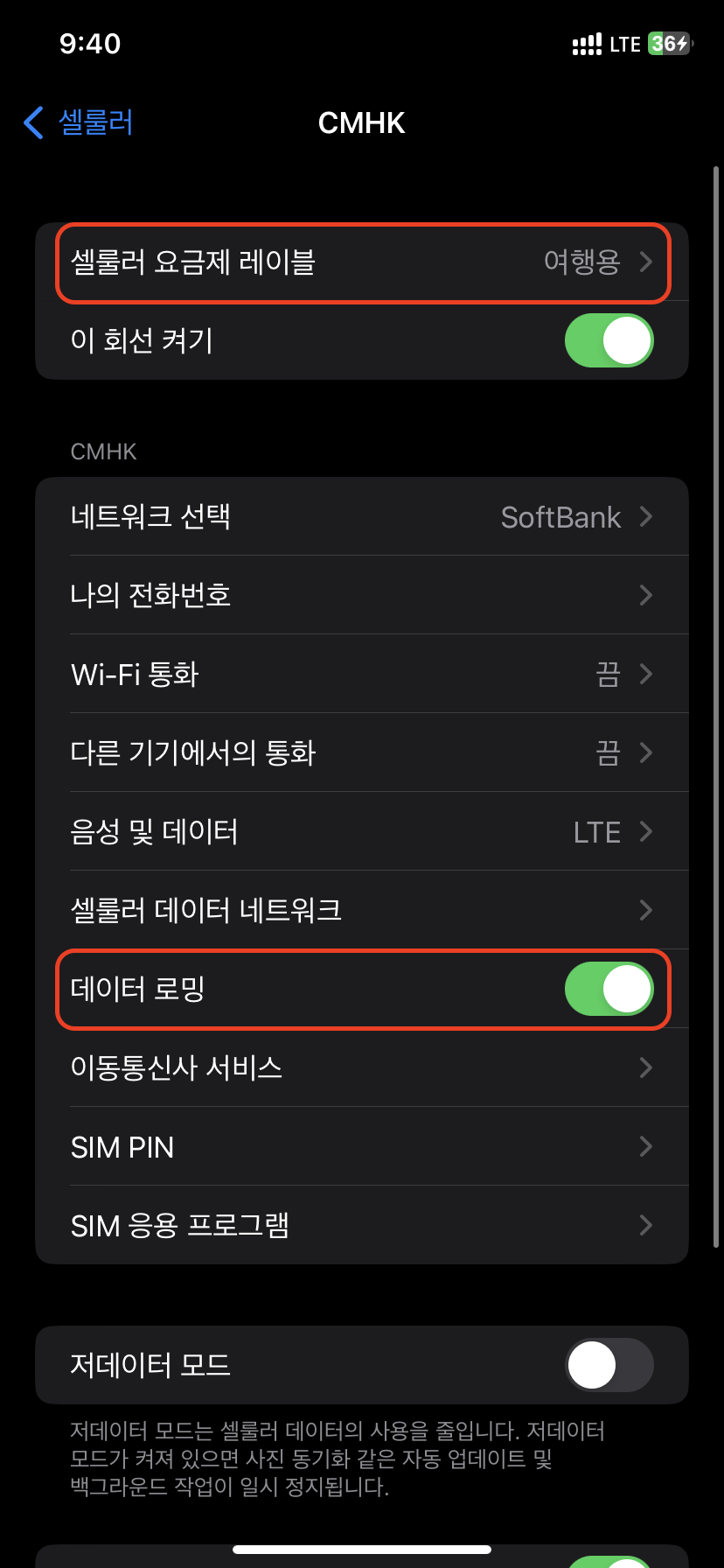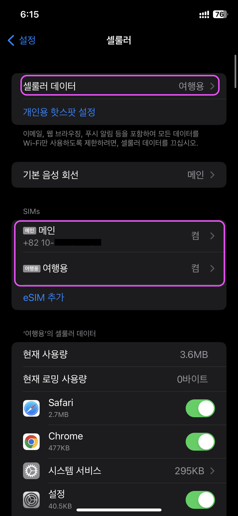 셀룰러가 데이터가 여행용으로 되어 있고 SIMs에 켜짐으로 되어 있는지 확인하면 끝!!