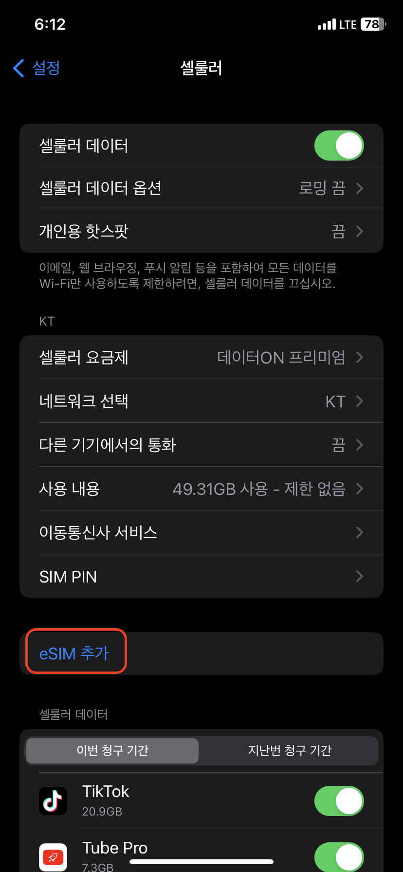 셀룰러 데이터는 e-SIM을 선택한다.