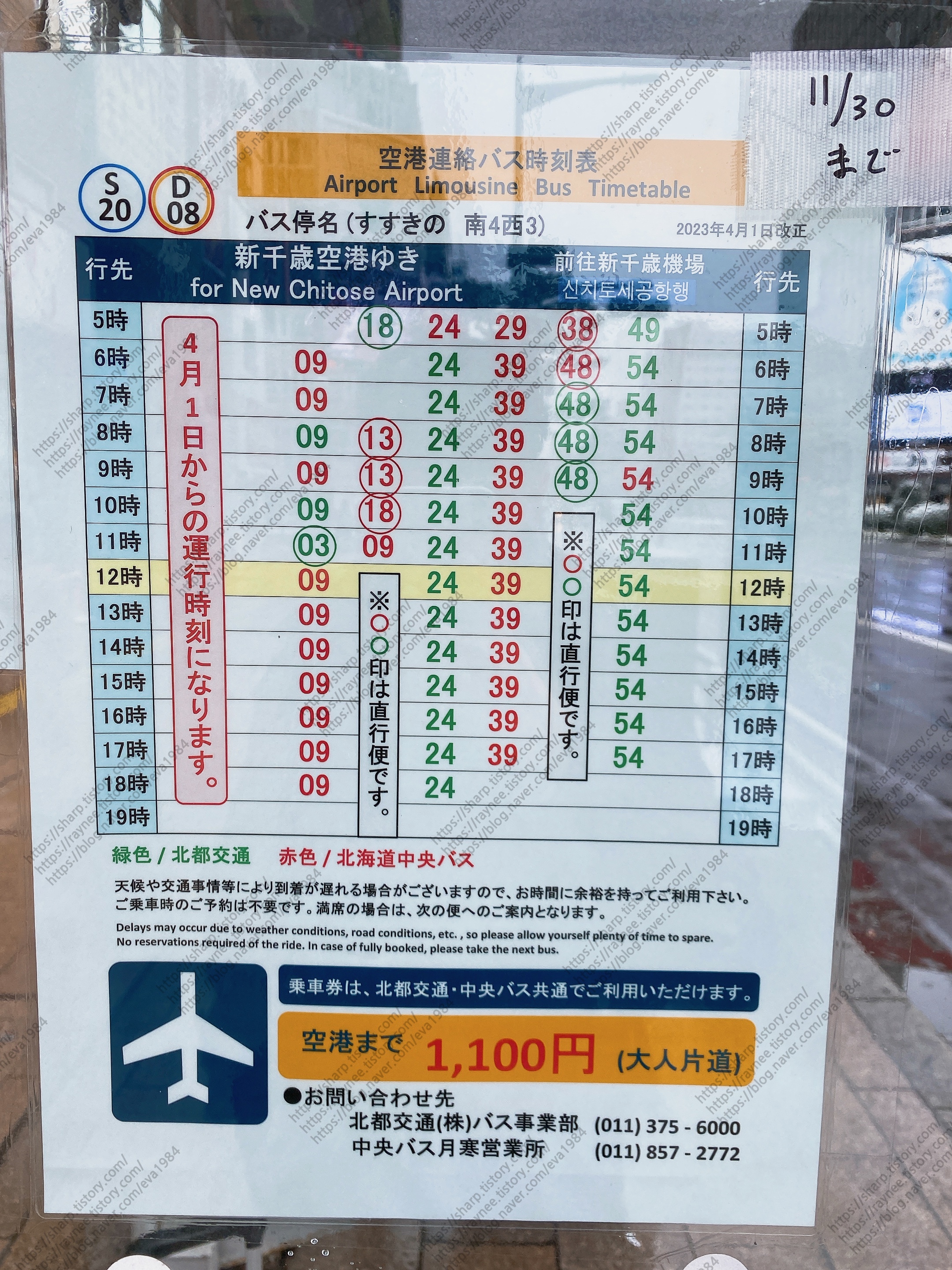 공항버스요금은 1100엔이고 빨간색 표시가 스스키노에서 공항으로 가는 직항버스이고 나머지는 경유이다.